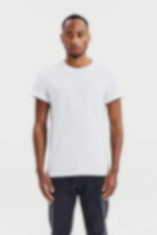 Unser klassisches Crew-Neck-T-Shirt mit regulärer Passform, jetzt mit hochgekrempelten Ärmeln. Das Modell hat hochgekrempelte Ärmel, die mit einer dezenten Naht fixiert sind, um sicherzustellen, dass sie nicht herunterrollen.