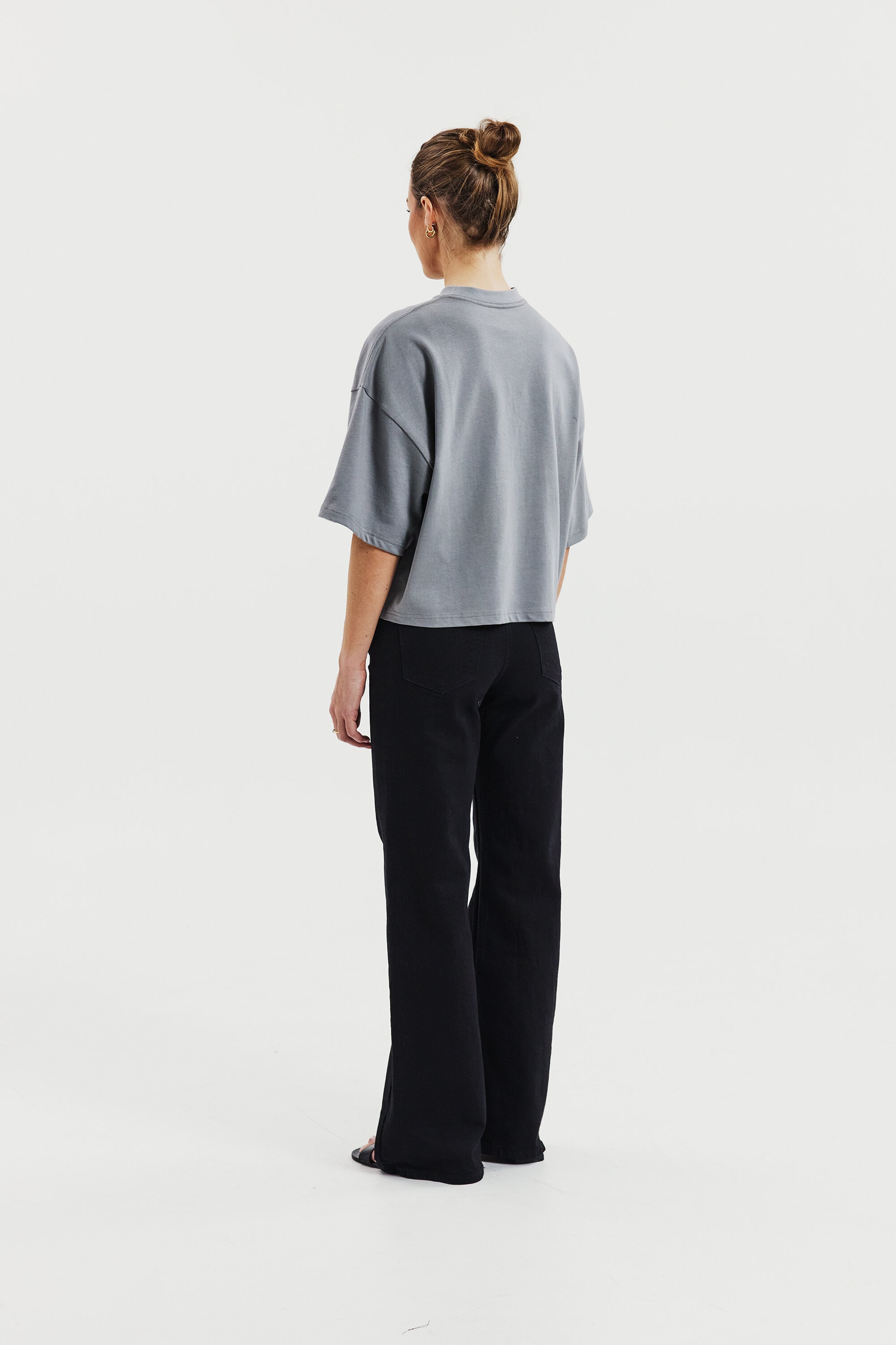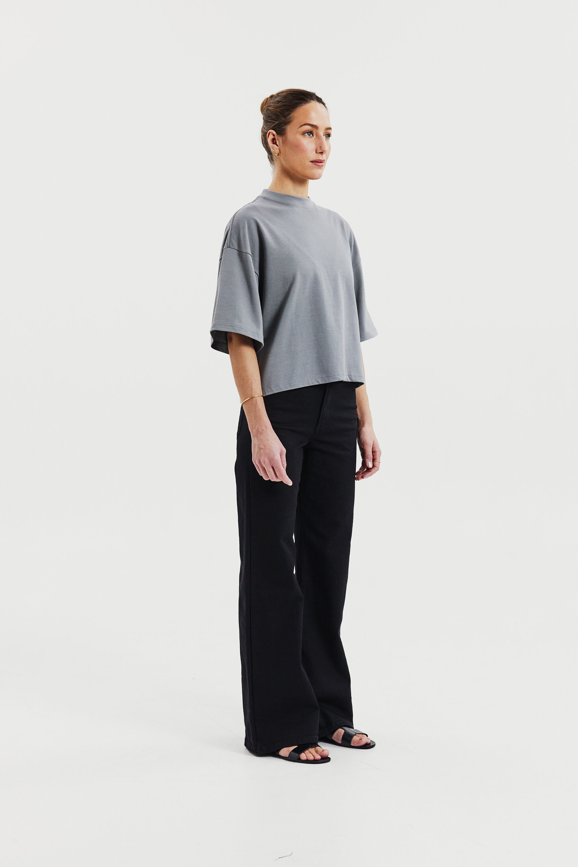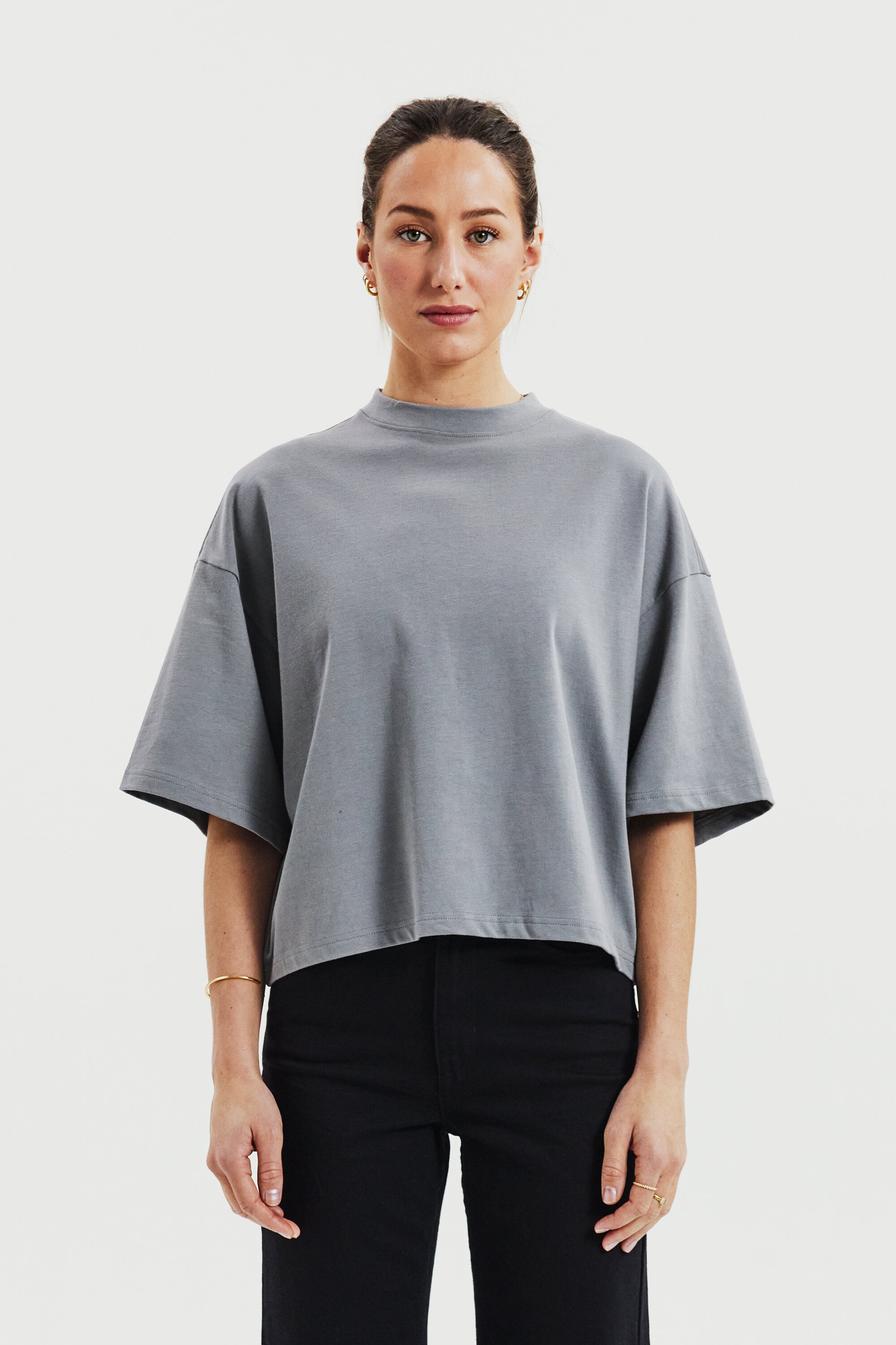 T-Shirt aus robustem 300 gsm Bio-Baumwollstoff gefertigt. Es verfügt über einen stabilen Halsausschnitt mit dekorativen Ziernähten und stilvollen Seitenschlitzen. Mit leicht verlängerten Ärmeln und breiteren Schultern erhält es einen subtilen Oversized-Look. Dieses Stück kommt besonders zur Geltung, wenn es solo getragen wird, und vermittelt eine mühelos coole Ästhetik.