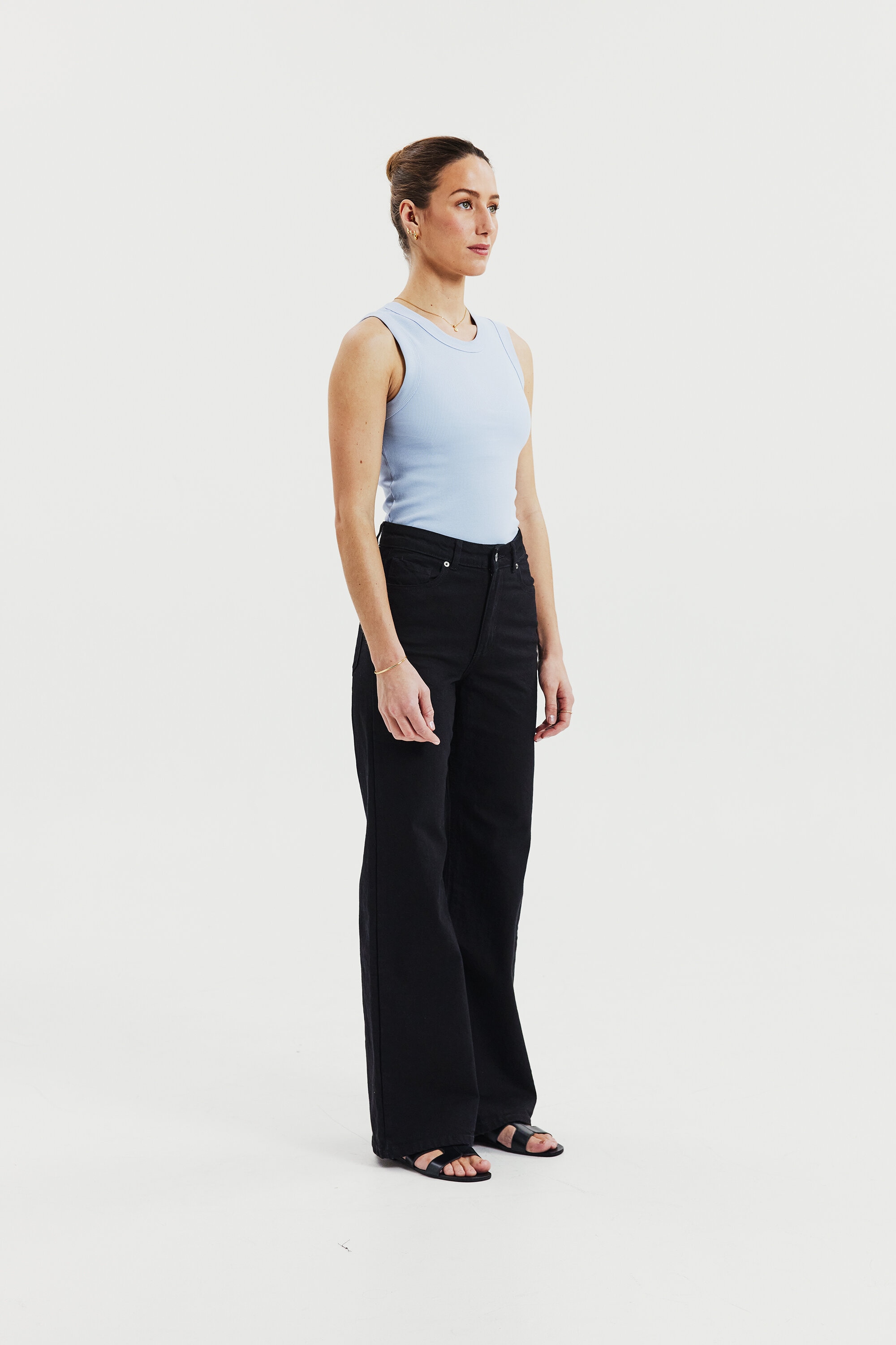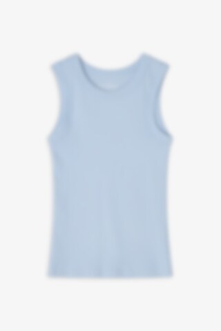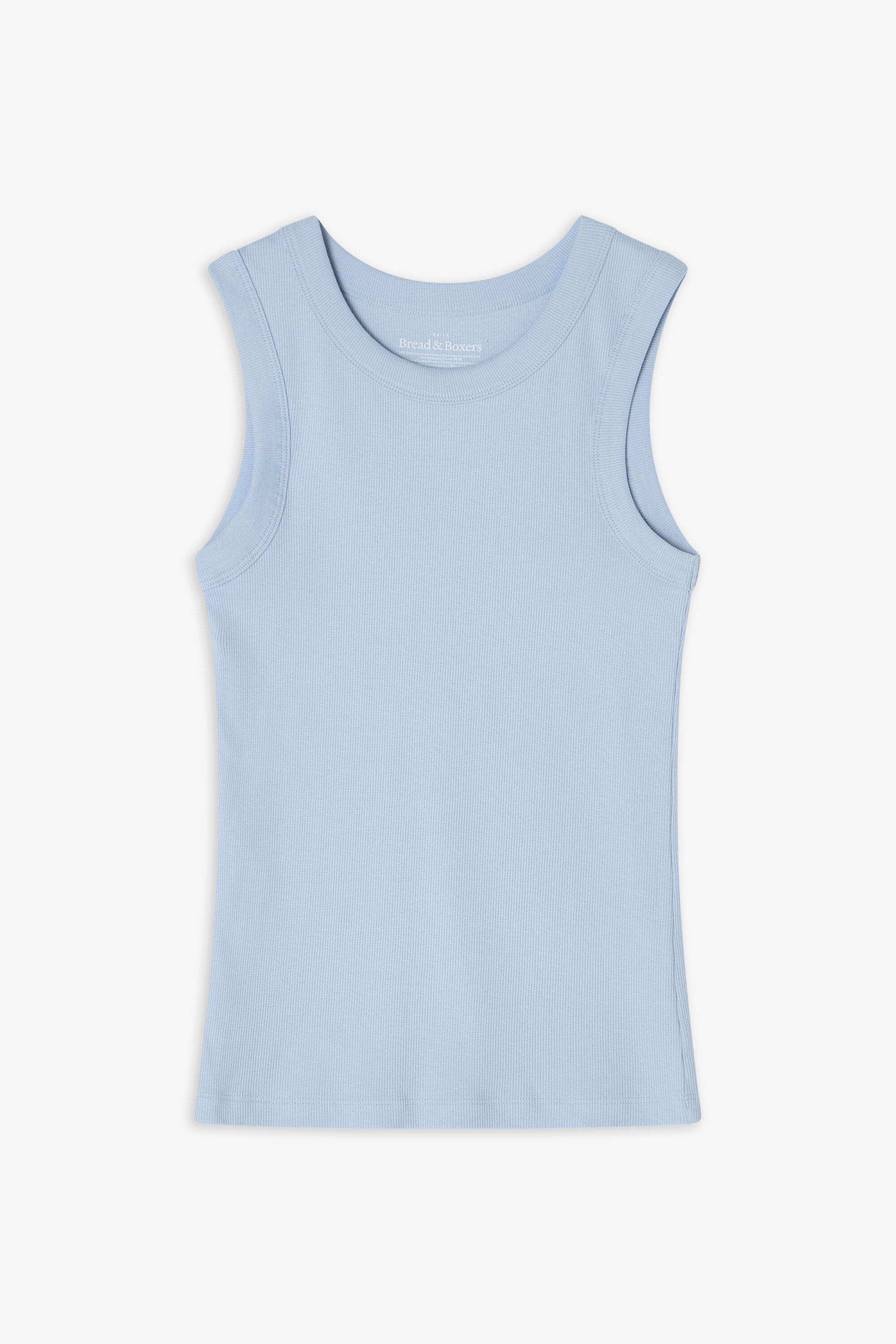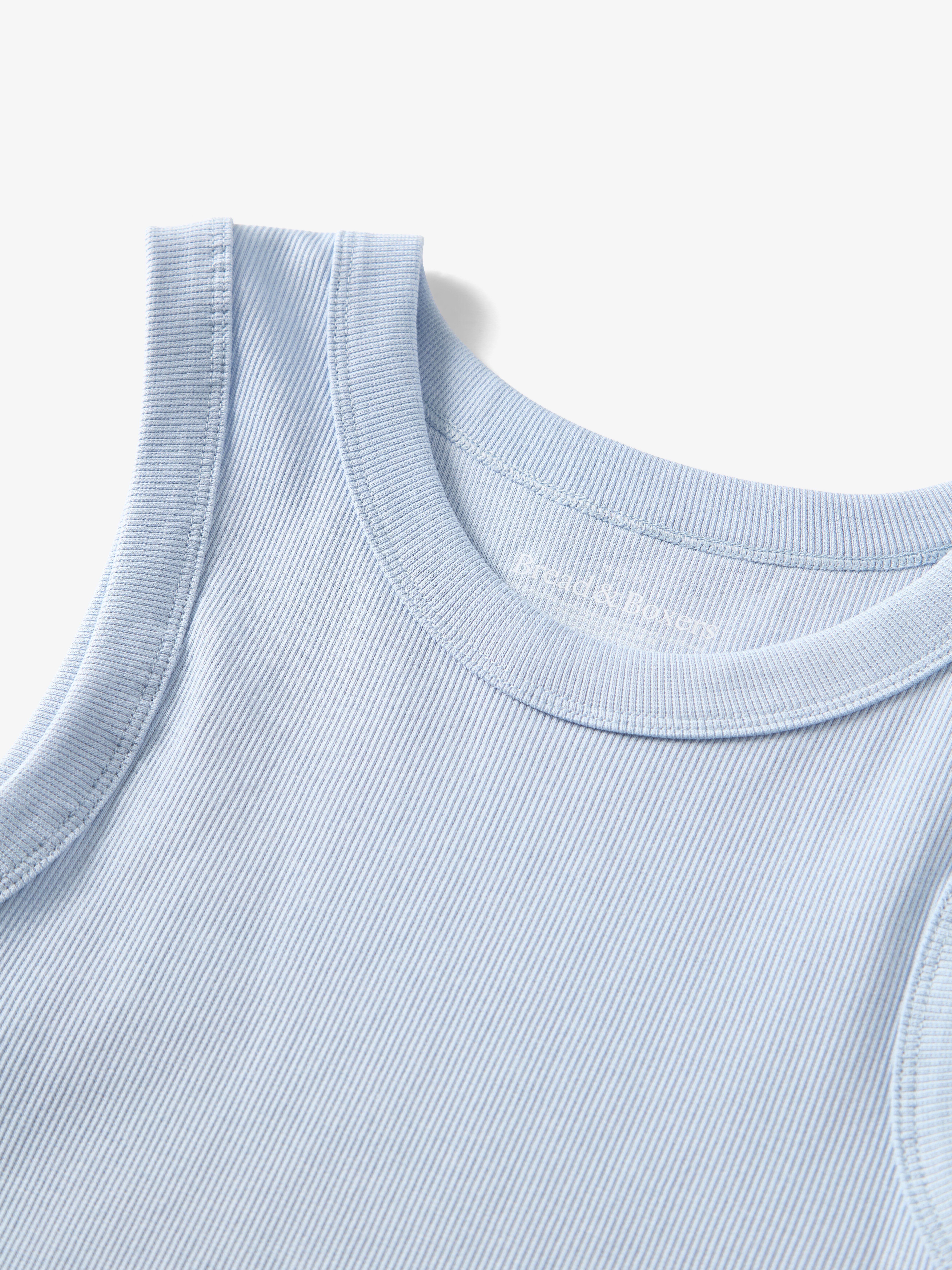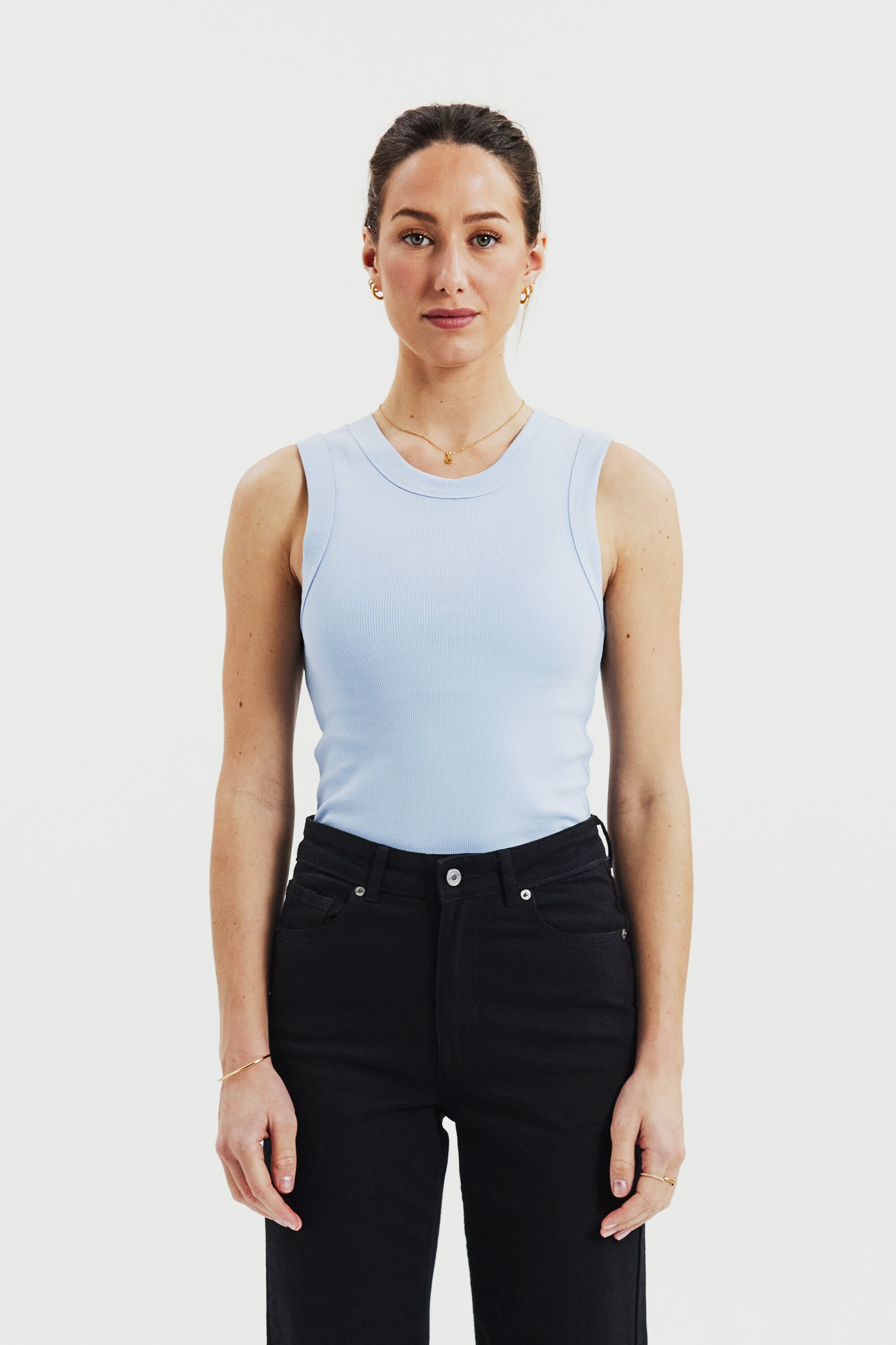 Geripptes Tanktop mit hohem Ausschnitt und etwas breiteren Trägern. Hergestellt aus biologischer Baumwolle mit zusätzlichem Stretch für eine figurbetonte Passform, die den ganzen Tag anhält. Passt perfekt zu Sommerröcken, aber auch als erster Layer unter einem Blazer – ein richtiger Held der Garderobe.