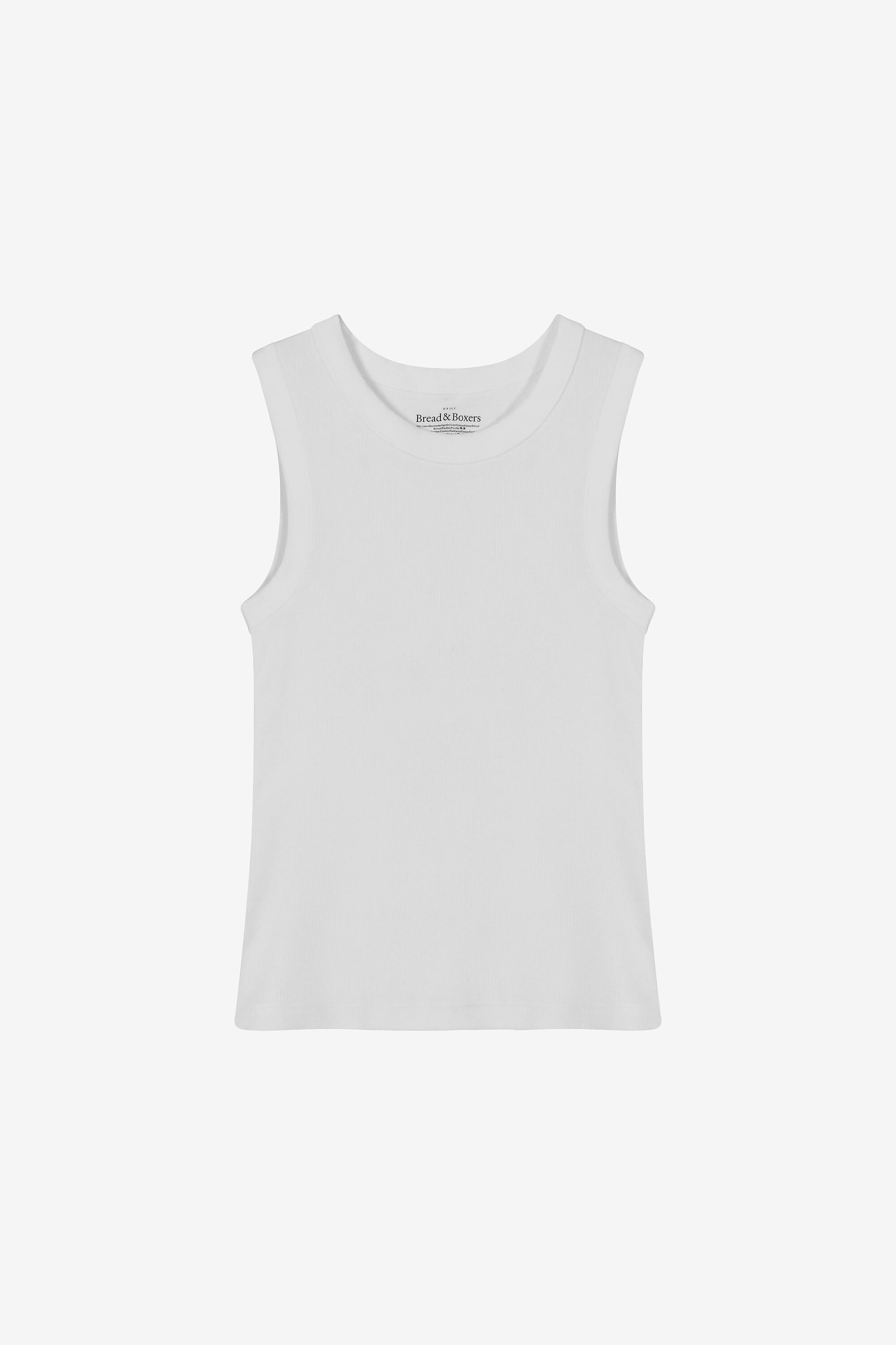 Geripptes Tanktop mit hohem Ausschnitt und etwas breiteren Trägern. Hergestellt aus biologischer Baumwolle mit zusätzlichem Stretch für eine figurbetonte Passform, die den ganzen Tag anhält. Passt perfekt zu Sommerröcken, aber auch als erster Layer unter einem Blazer – ein richtiger Held der Garderobe.